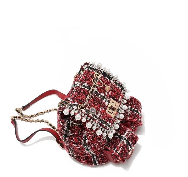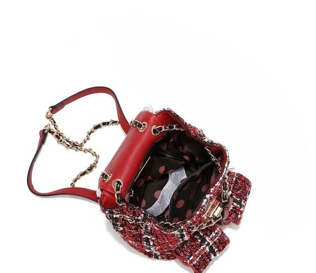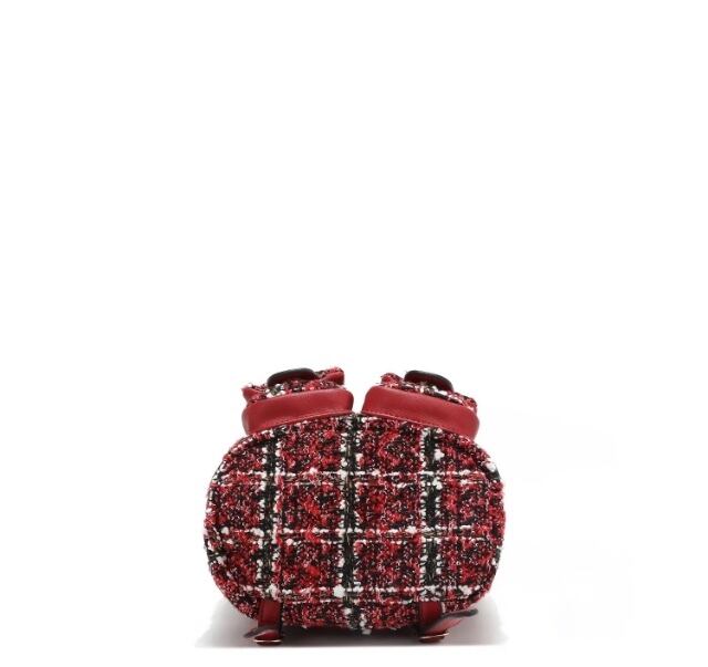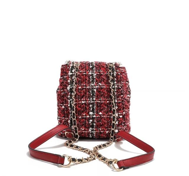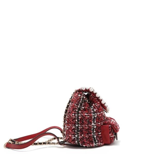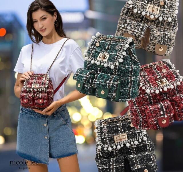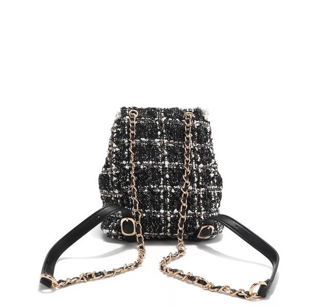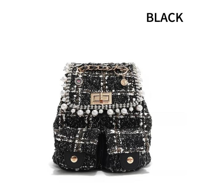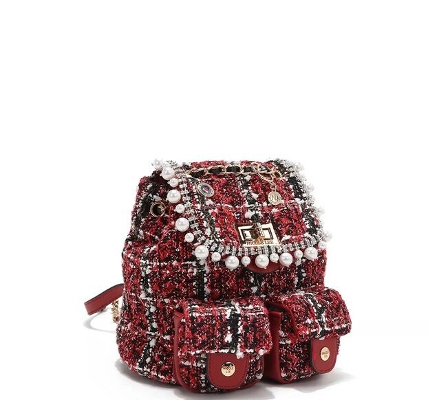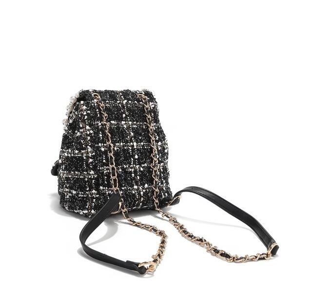 Designed for those who want to travel light without compromising on style, our mini tweed backpack is exquisitely crafted from tweed adorned with sparkling sequins. Keep your small essentials organized in the front pockets or main compartment, secured by a reliable turn-lock closure. Plus, the chain top handle and adjustable shoulder straps offer versatile carrying options, making it the perfect accessory for any adventure!