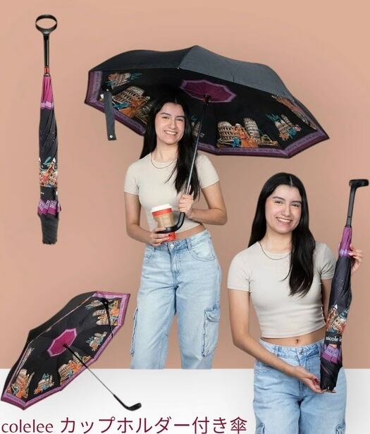 逆さに閉じるデザインで内側から外側に開くので、雨漏りすることなく持ち運べます。カップホルダーハンドルが付いているので、コーヒーを持ち運ぶのにも便利です。(タンブラーは付きません)