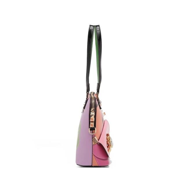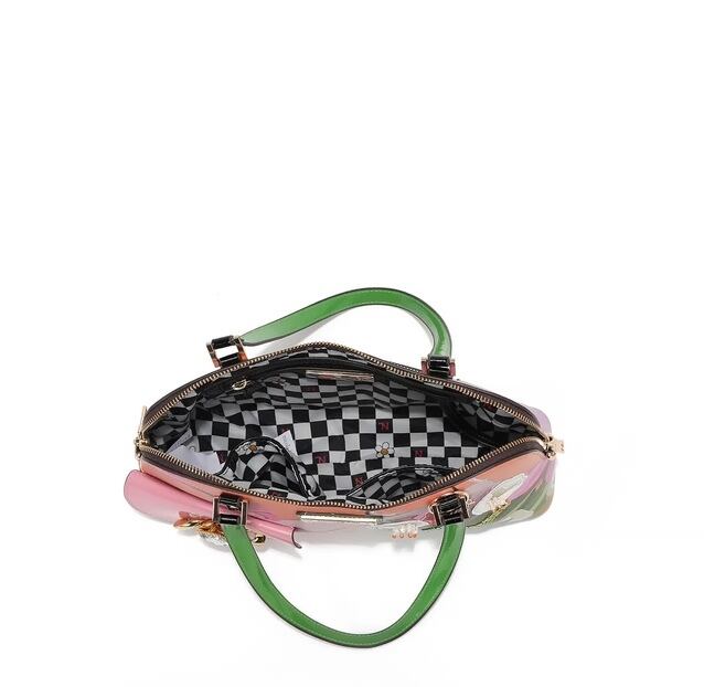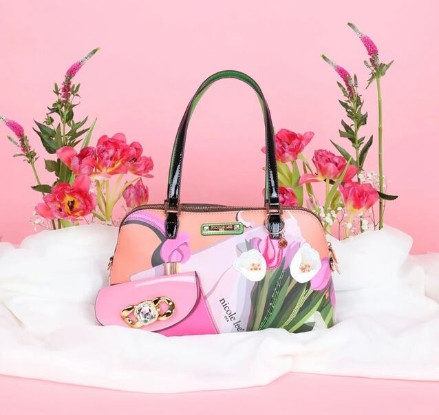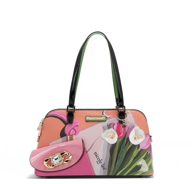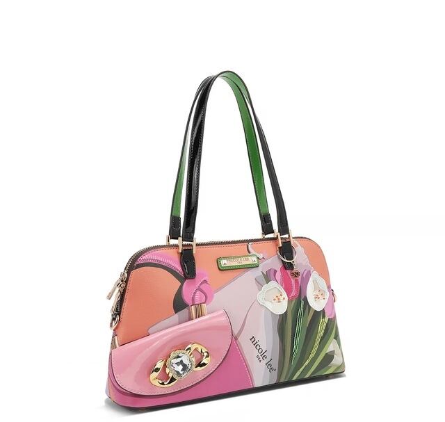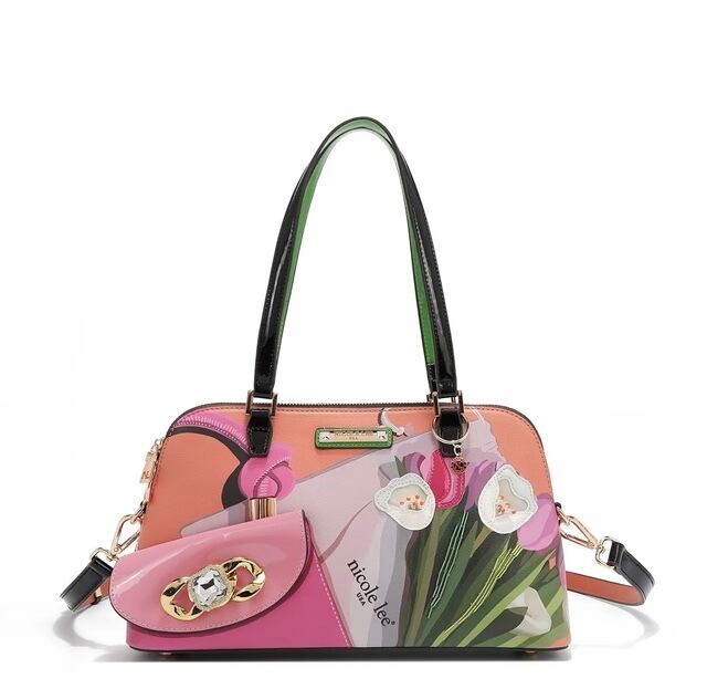 This dome-shaped shoulder bag features captivating tulip appliques, bead and stone embellishments, and a luxurious gold-tone chain link with a diamond stone accent. With its sleek and structured shape and fresh spring hues, it's designed to add a graceful touch to every outfit — from day to night.