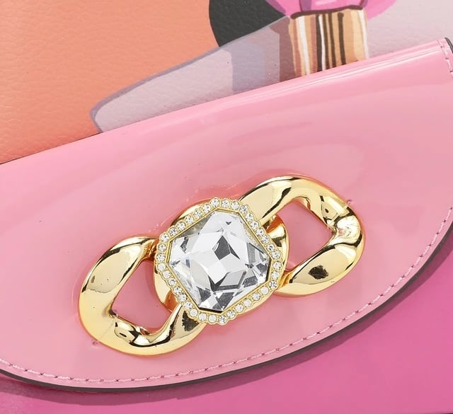 ・ロゴが刻印されたリボンジッパープルとダイヤモンドラインストーンのネームプレート