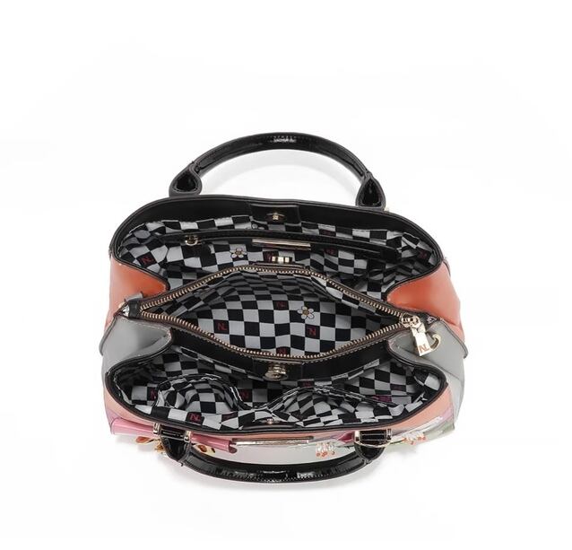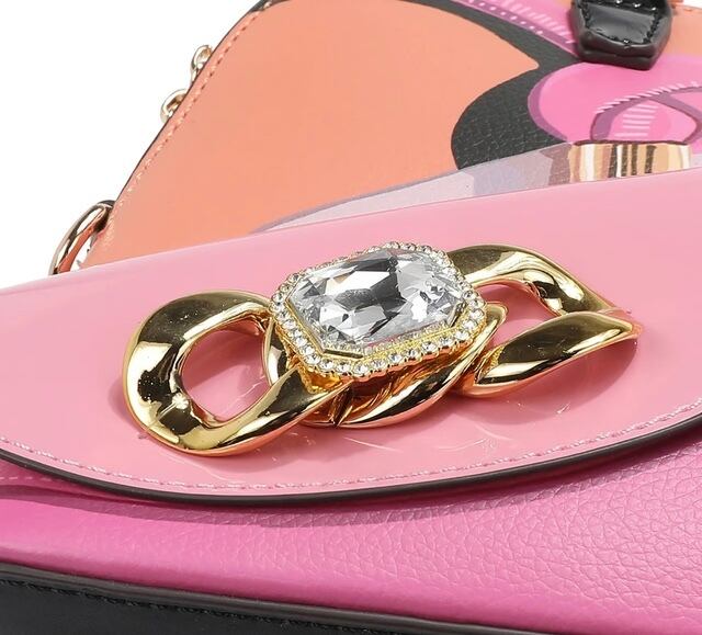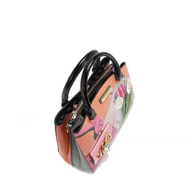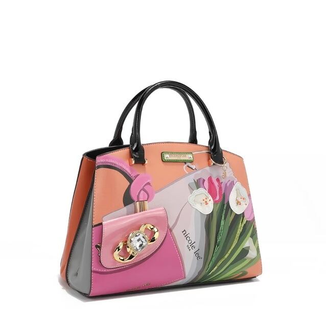 Designed with three spacious compartments, this satchel captures the beauty of blooming tulips with intricate vegan leather appliques and shimmering bead embellishments. A high-shine gold-tone chain link with a diamond stone accent adds a touch of luxury, while its structured silhouette keeps your look polished—perfect for work, brunch, or any spring outing.