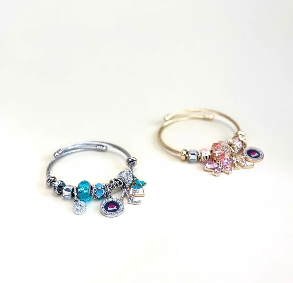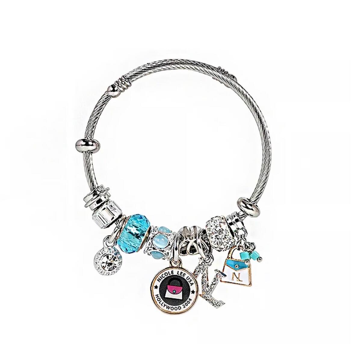 Perfect for stacking or wearing solo, this expandable charm bracelet is a must-have statement piece for fashion lovers. Featuring a sleek silver-tone wire bangle, each charm tells a unique story, from glimmering blue crystal beads to double hearts and a cute mini NL handbag.