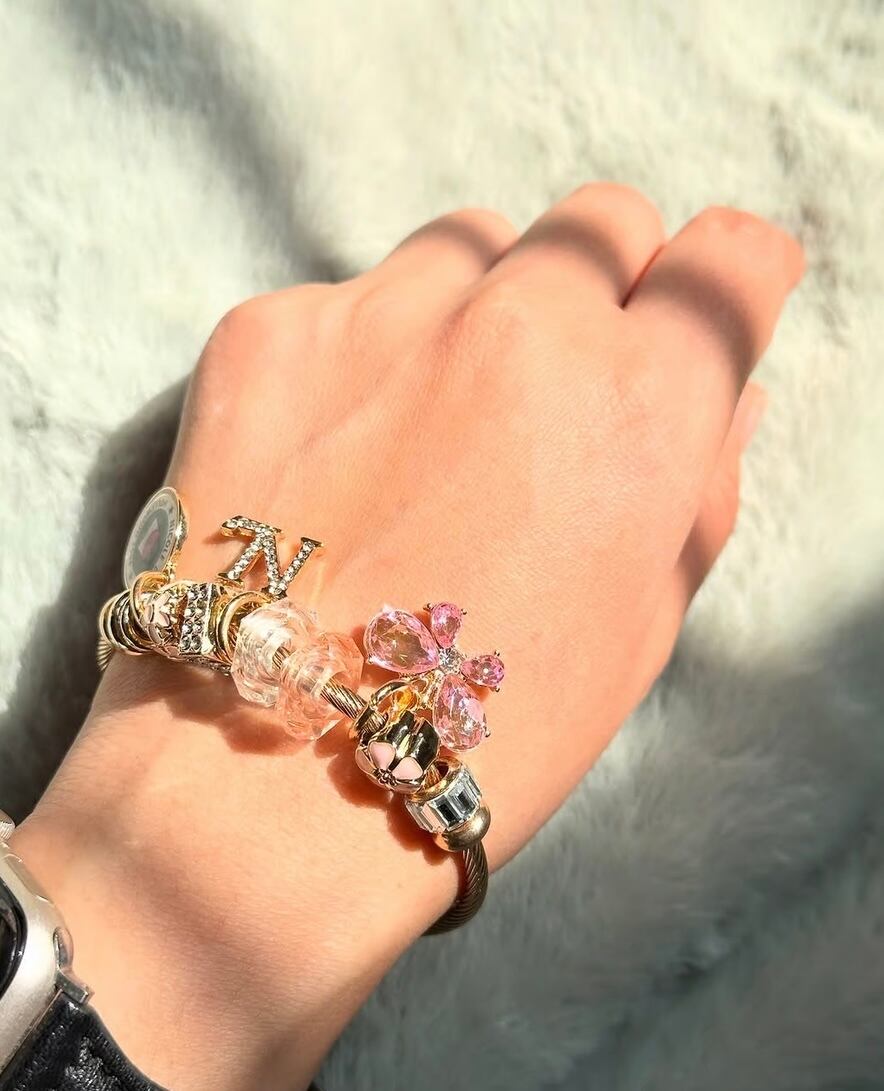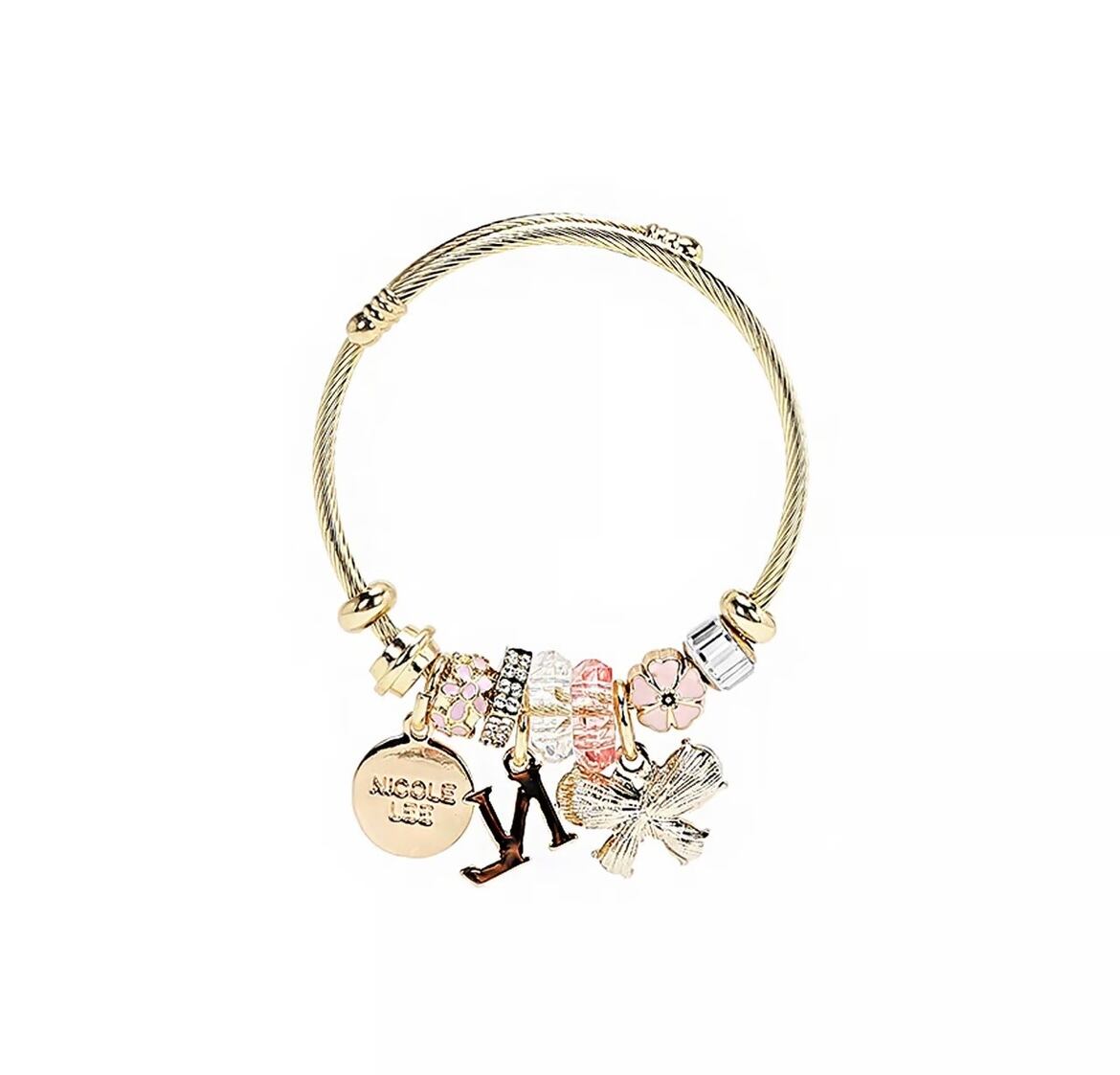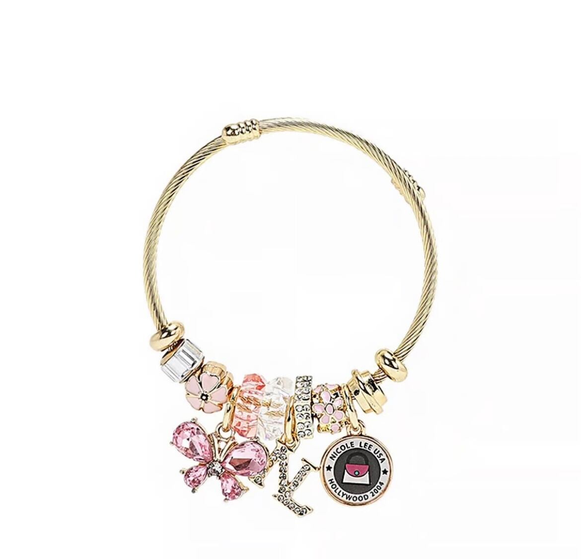 Perfect for stacking or wearing solo, this expandable charm bracelet is a must-have statement piece for fashion lovers. Featuring a sleek silver-tone wire bangle, each charm tells a unique story, from glimmering blue crystal beads to double hearts and a cute mini NL handbag.