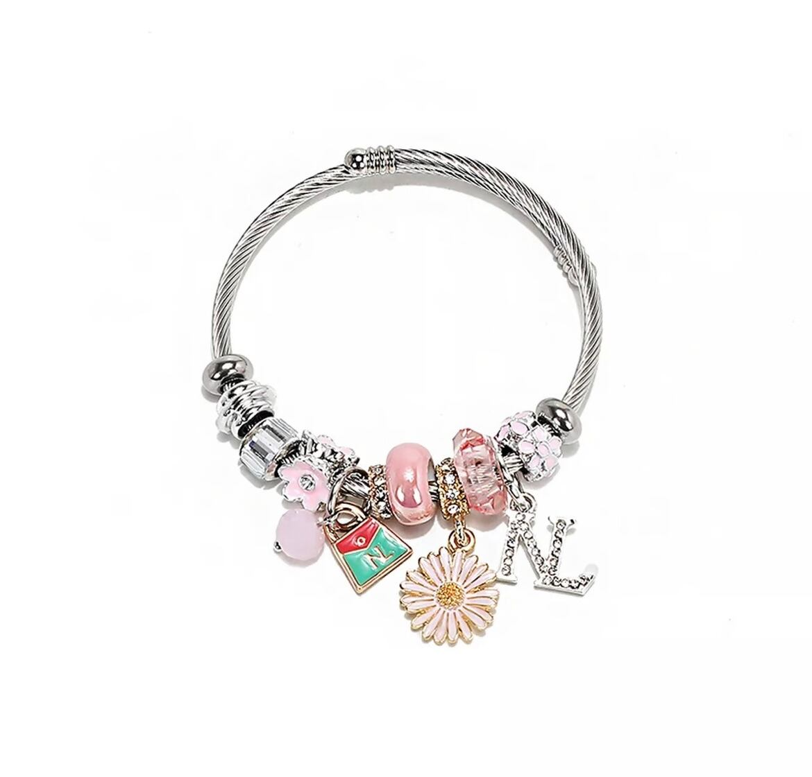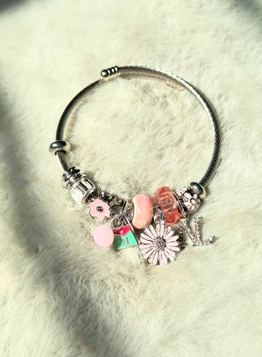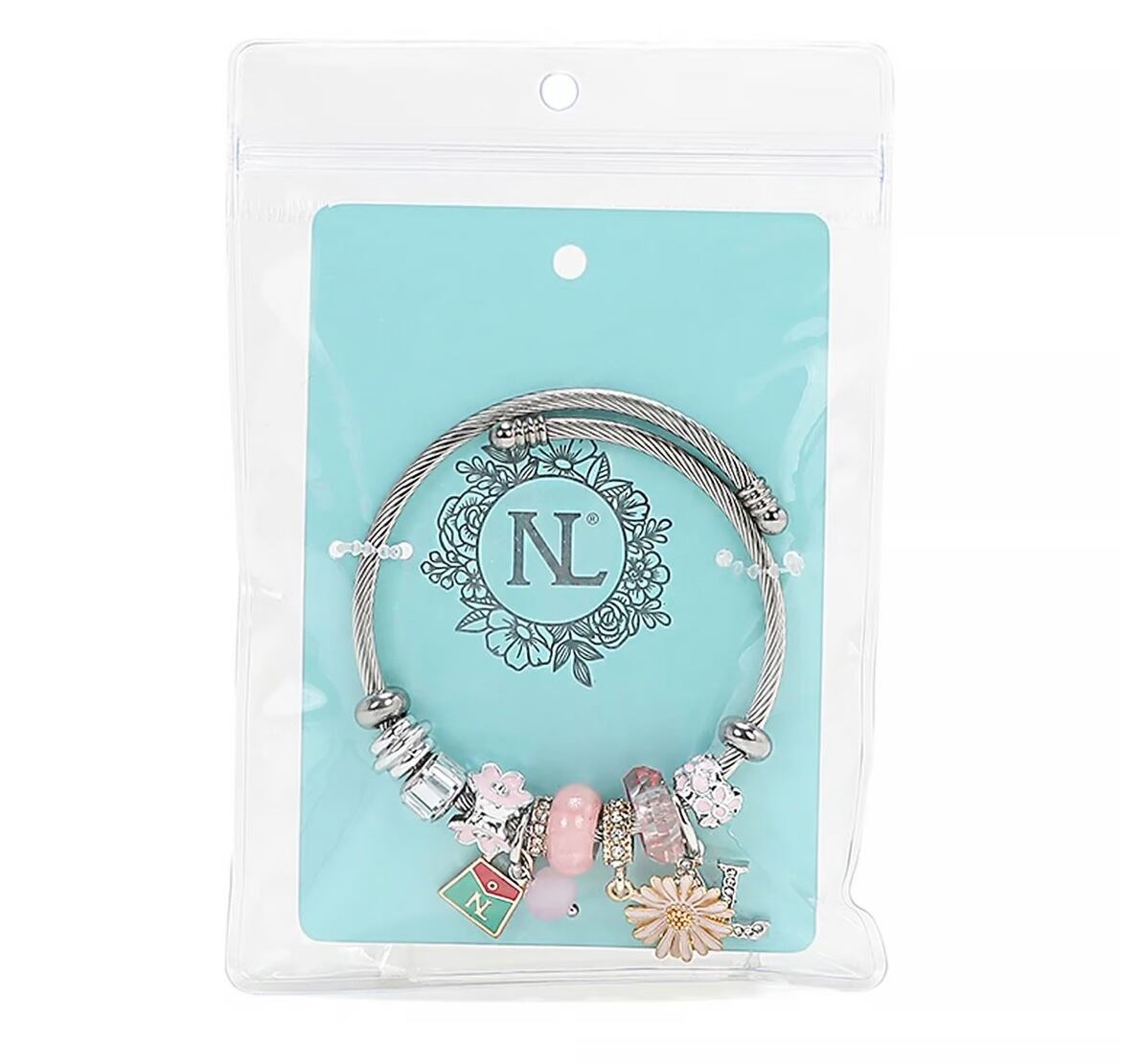 Perfect for stacking or wearing solo, this expandable charm bracelet is a must-have statement piece for fashion lovers. Featuring a sleek silver-tone wire bangle, each charm tells a unique story, from glimmering blue crystal beads to double hearts and a cute mini NL handbag.