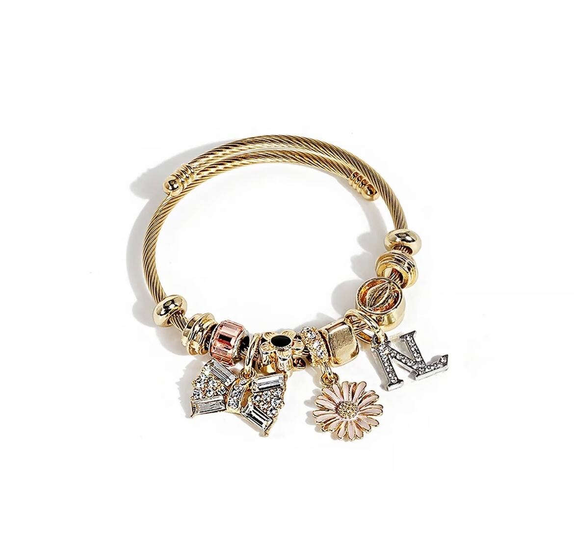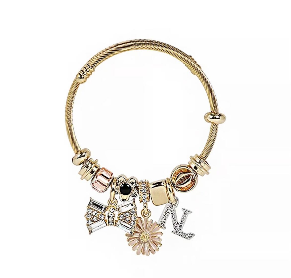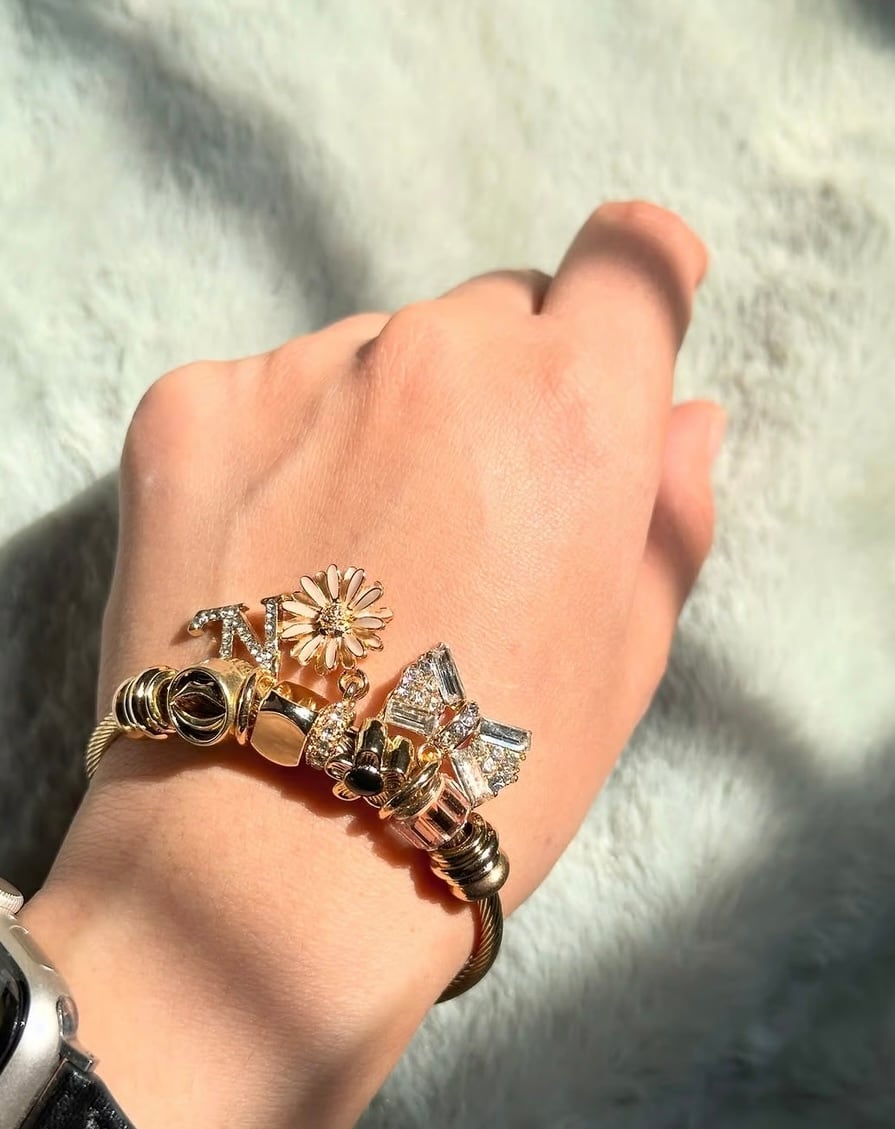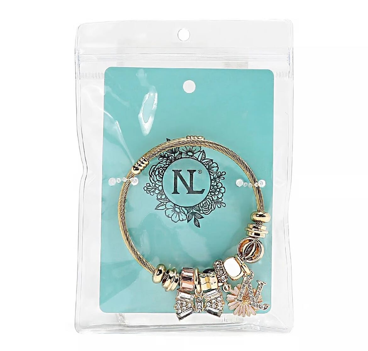 Perfect for stacking or wearing solo, this expandable charm bracelet is a must-have statement piece for fashion lovers. Featuring a sleek silver-tone wire bangle, each charm tells a unique story, from glimmering blue crystal beads to double hearts and a cute mini NL handbag.
