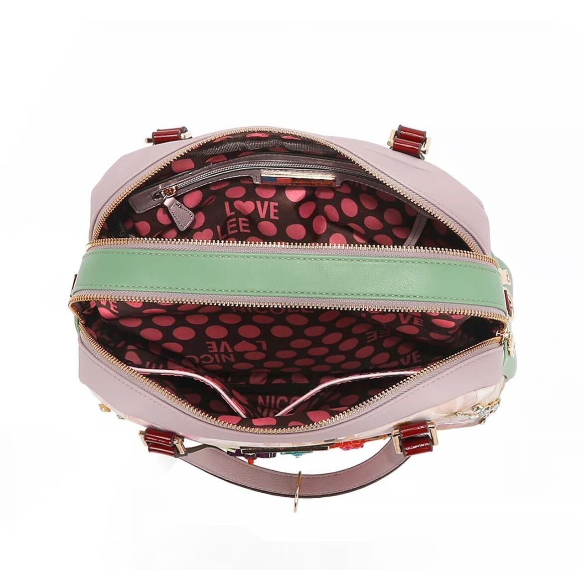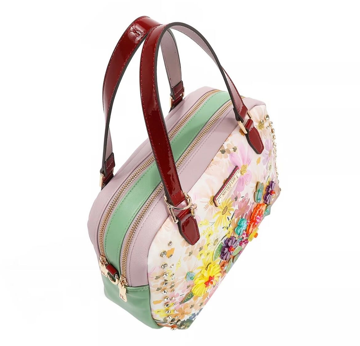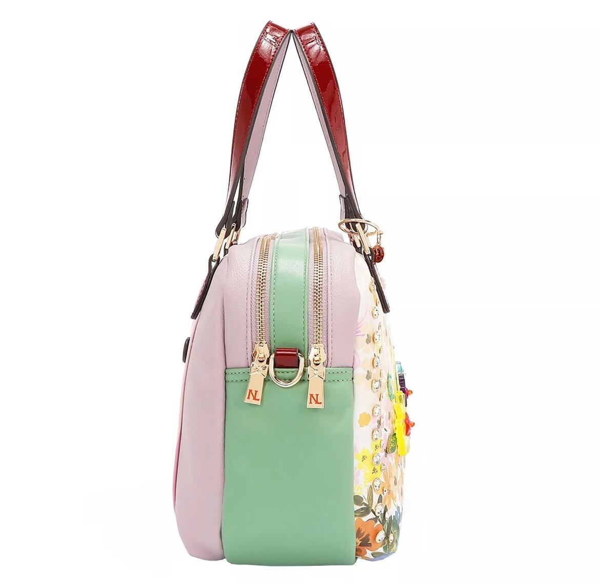 パステルカラーの花びらときらめく装飾が織りなすドラマティックなハンドバッグ。柔らかな曲線と輝く花のアップリケが旅への情熱と咲き誇る夢の物語を紡ぎます。