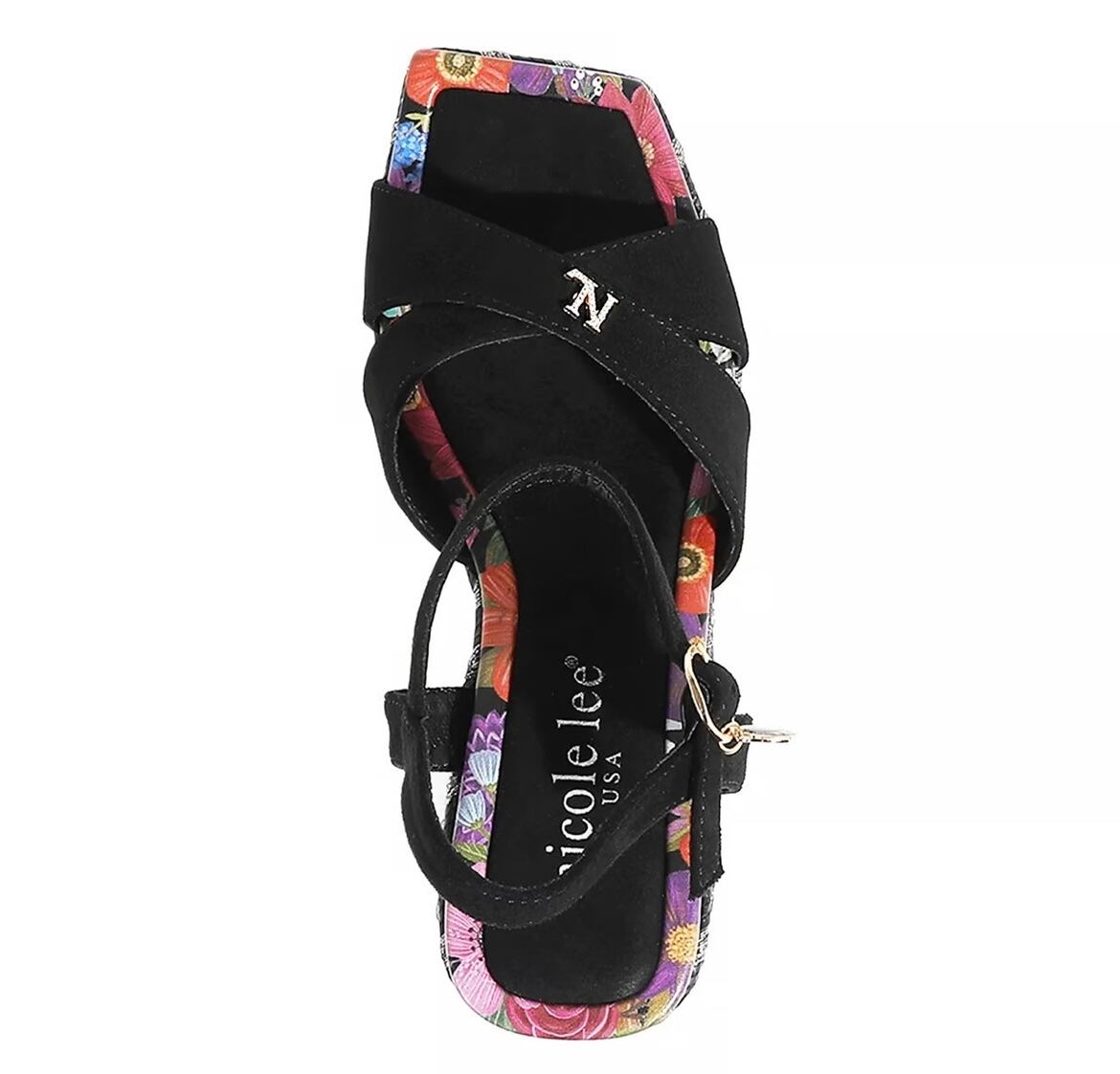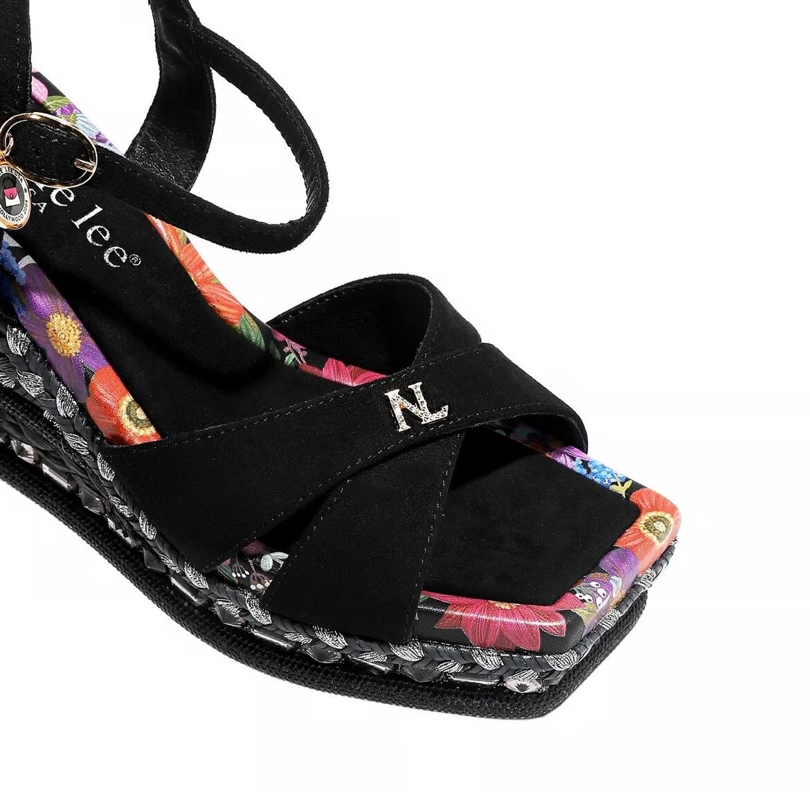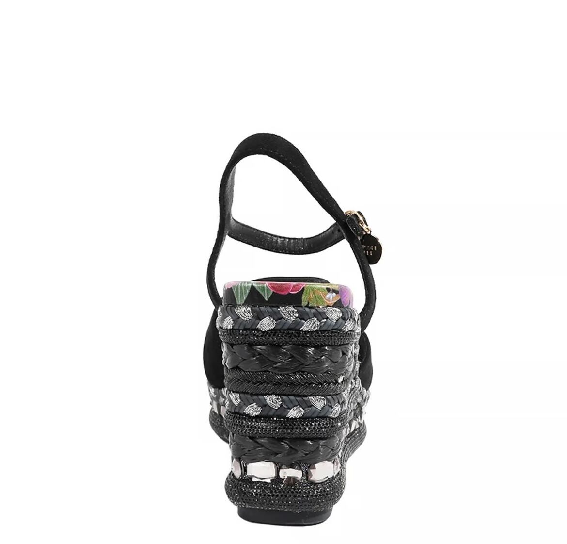 様々なテクスチャと装飾を巧みに組み合わせたボニーウェッジサンダルは、繊細な織りのディテール、ラインストーンのアクセント、そして大胆でフェミニンな雰囲気を醸し出すフローラルプリントのインソールが特徴です。