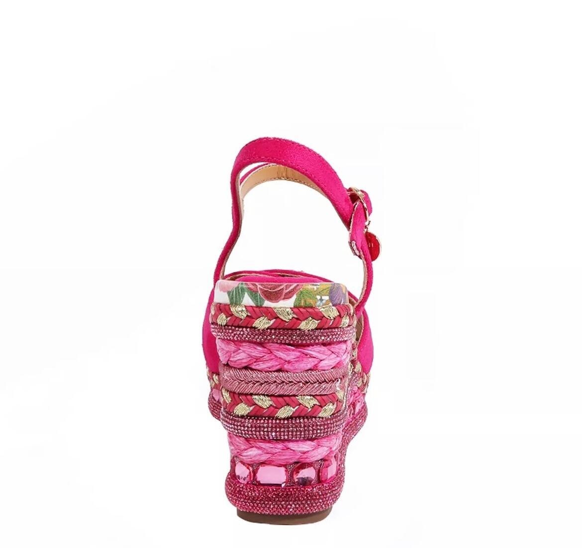 様々なテクスチャと装飾を巧みに組み合わせたボニーウェッジサンダルは、繊細な織りのディテール、ラインストーンのアクセント、そして大胆でフェミニンな雰囲気を醸し出すフローラルプリントのインソールが特徴です。