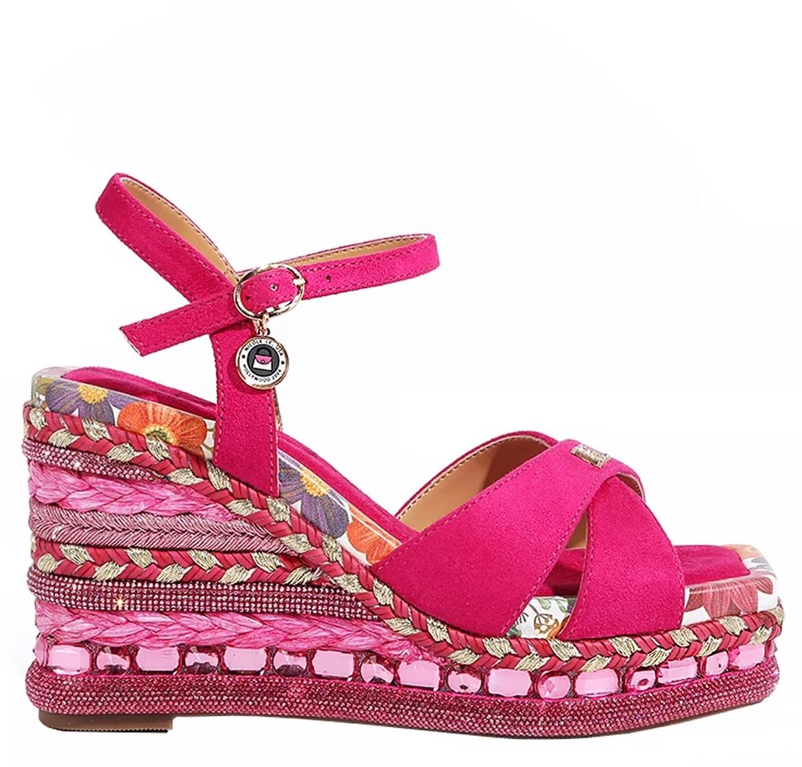 Featuring a stunning mix of textures and embellishments, our Bonnie wedges showcase intricate woven details, rhinestone accents, and a floral-printed insole for a bold, feminine touch. The crisscross suede straps add elegance, while the adjustable ankle strap with a charm detail ensures a secure and stylish fit.