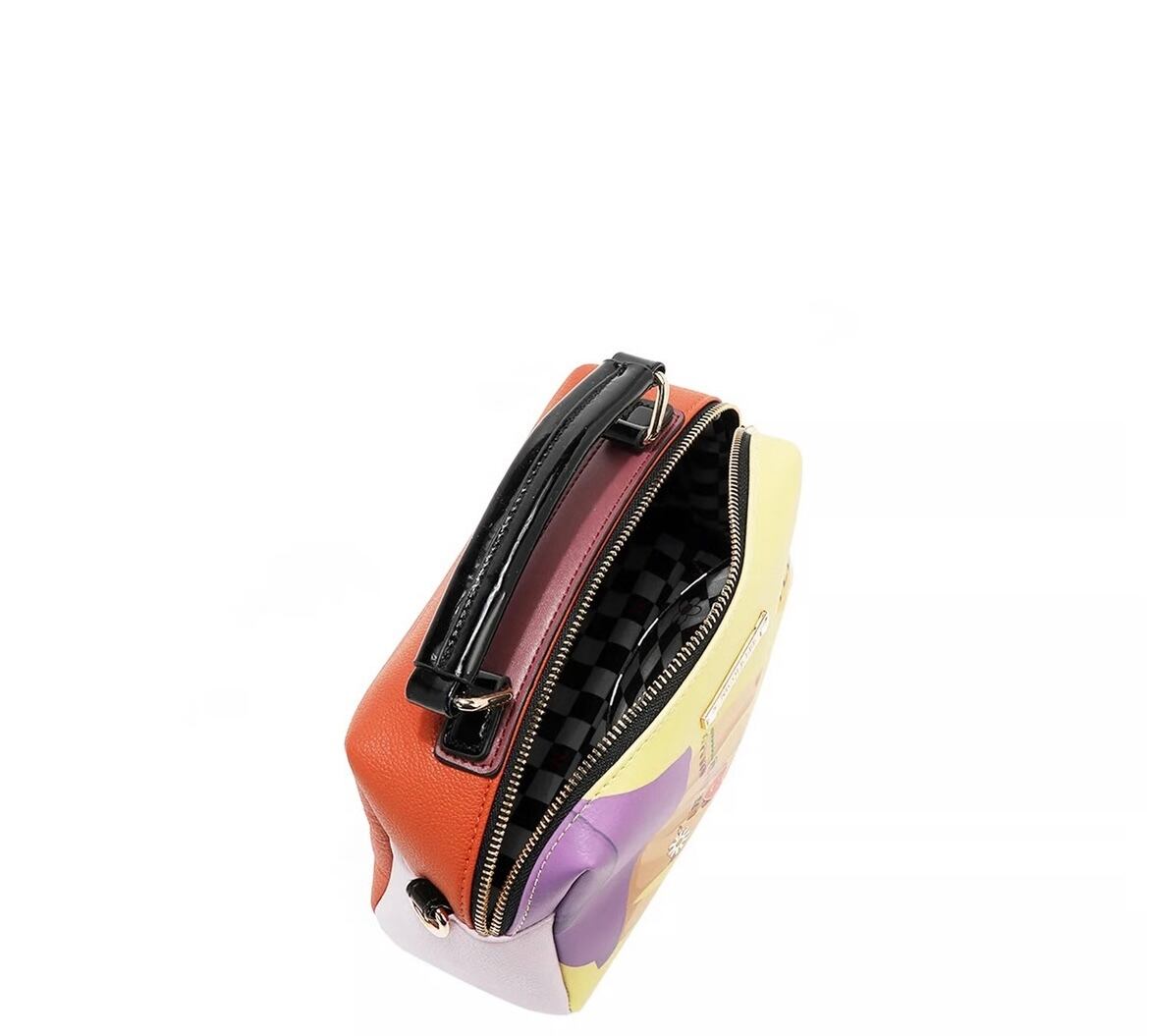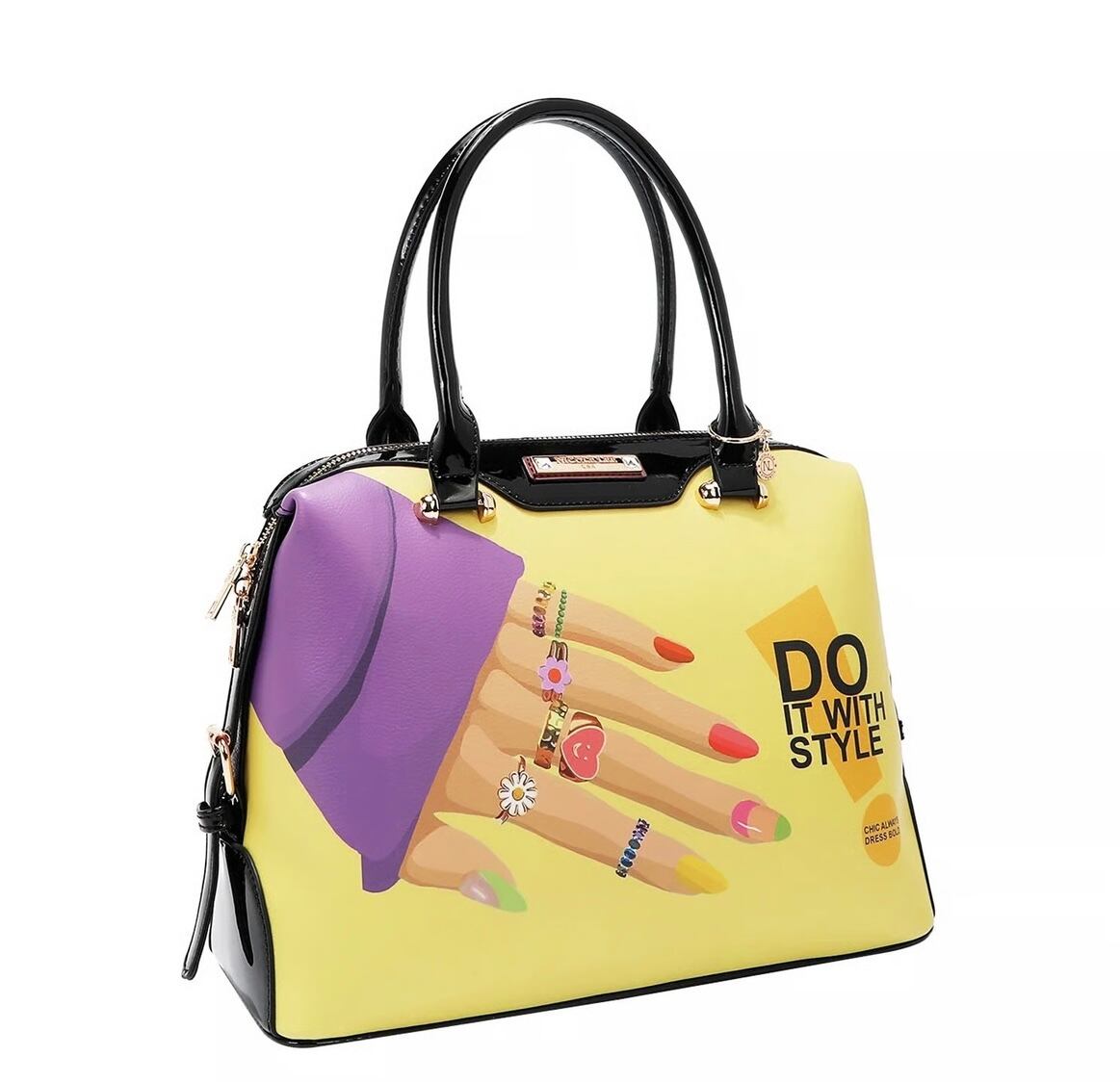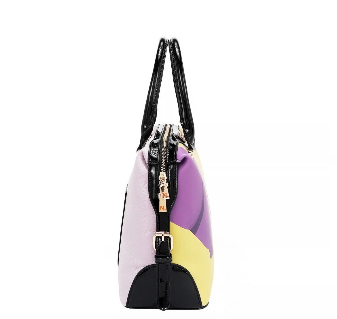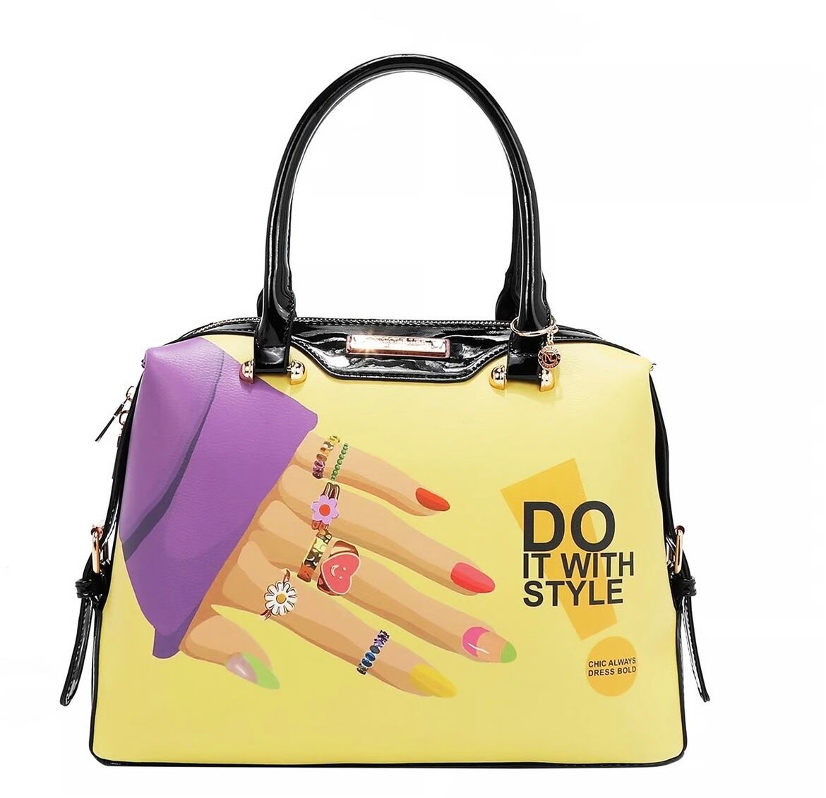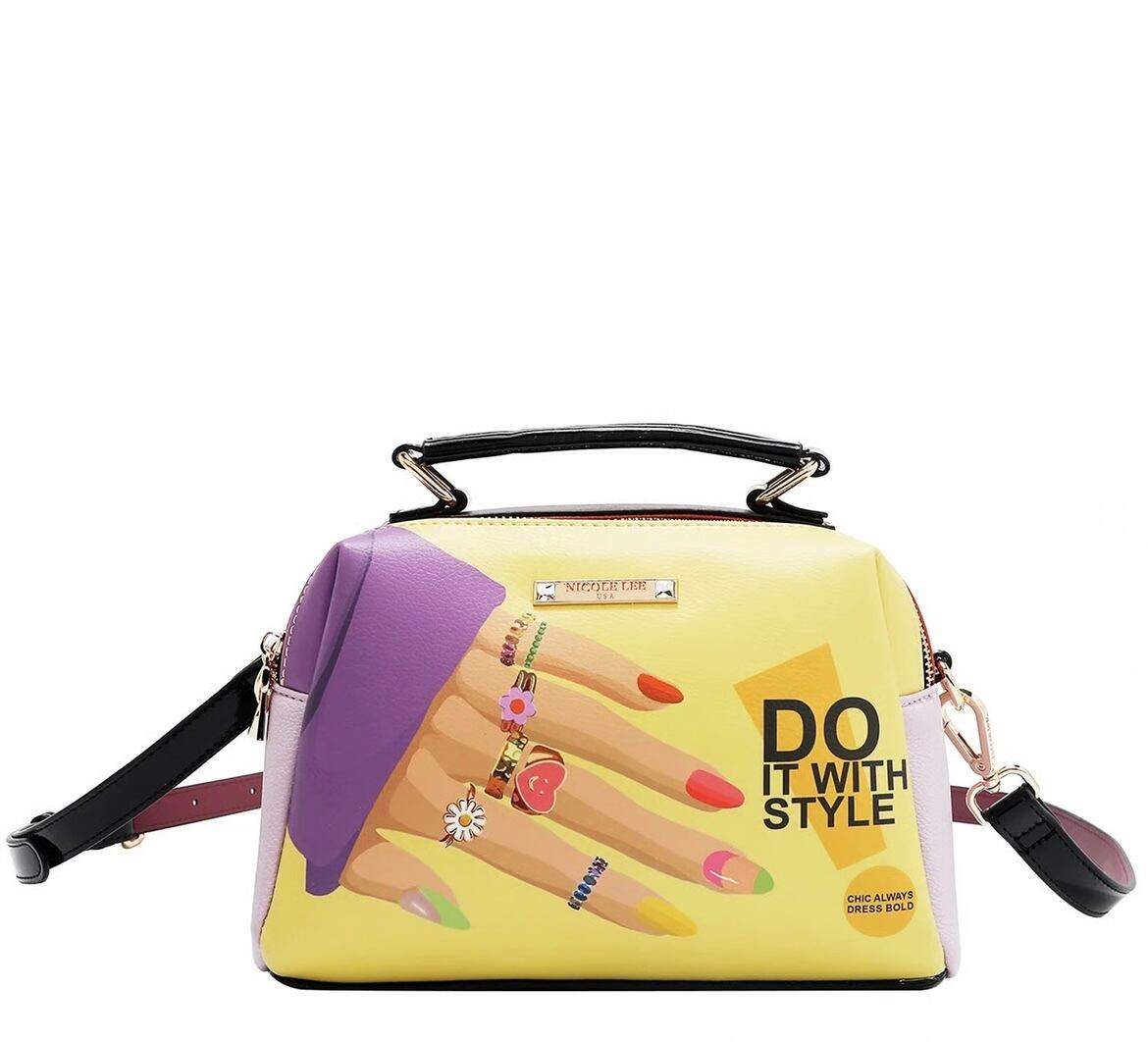 大きめのハンドバッグ、小さめのクロスボディバッグ、ジップウォレットが揃った3点セット。それぞれに鮮やかなネイルポリッシュプリントが施されています。