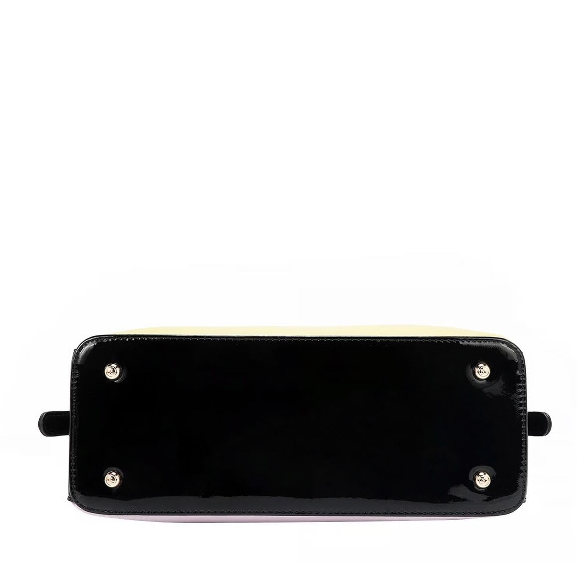 ・光沢のあるパテントレザーのアクセントが付いたヴィーガンレザーの外装