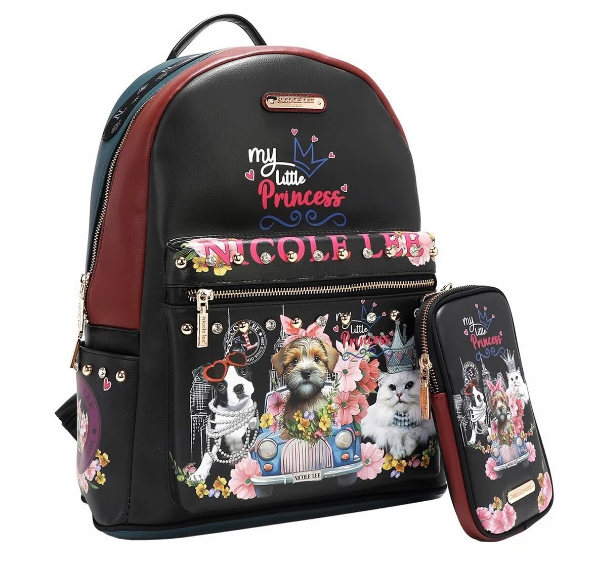 ・ダイヤモンドラインストーンとスタッズが散りばめられたフロントジップポーチ