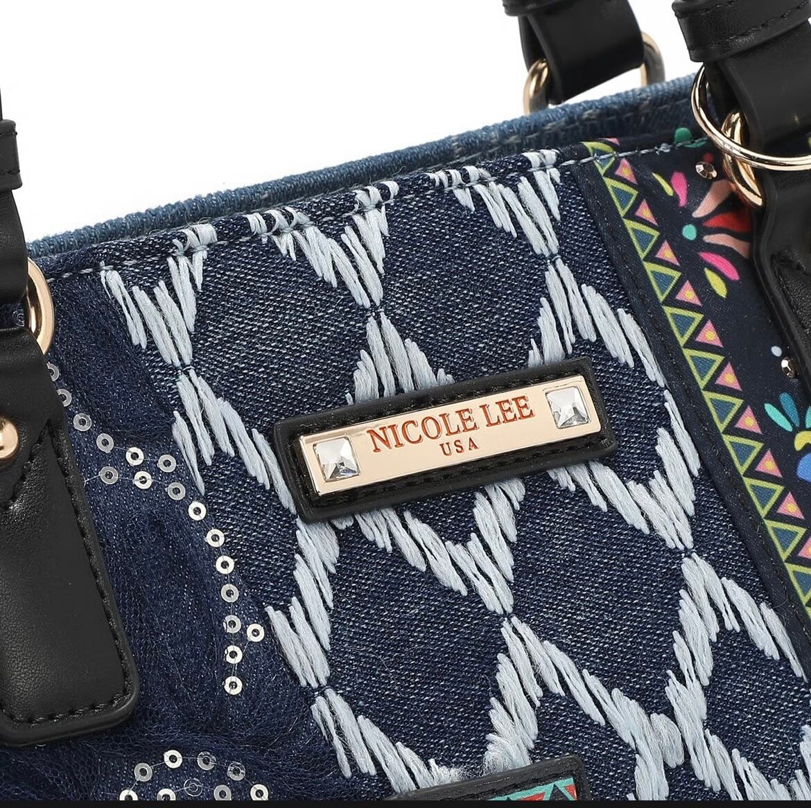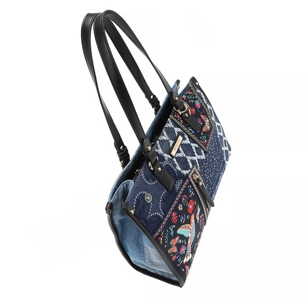 大胆でシックなボヘミアン調が美しい「Bosque de Amor」デニムトートバッグ。遊び心溢れるデザインがコーディネートを引き立てます。