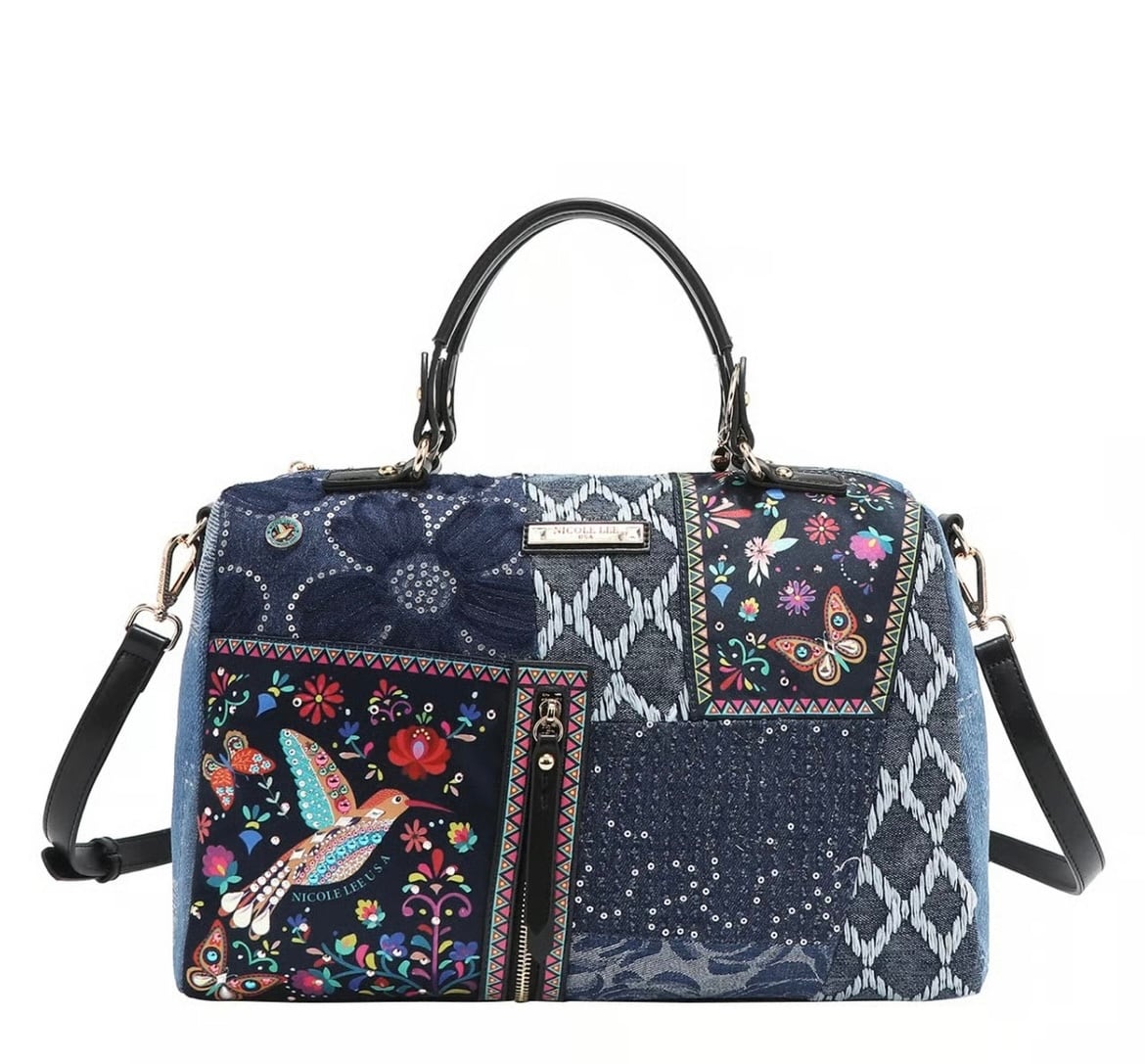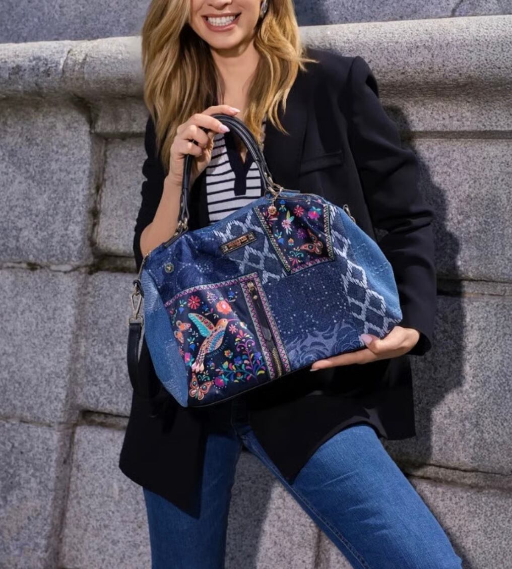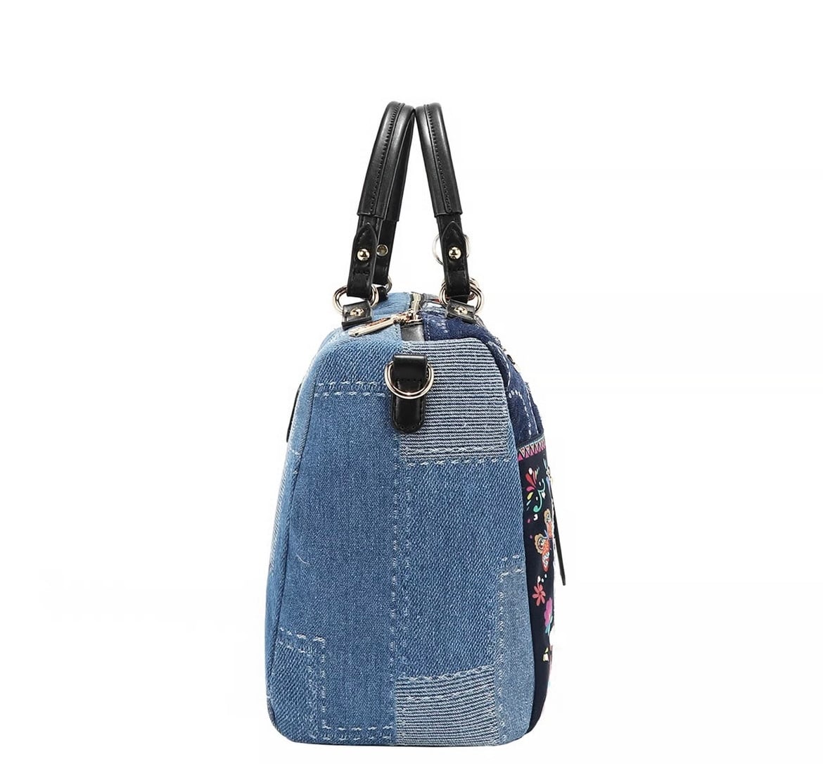 Let your look tell a story with the "Bosque de Amor" Denim Boston Bag a mystical touch for bold, boho-chic souls.