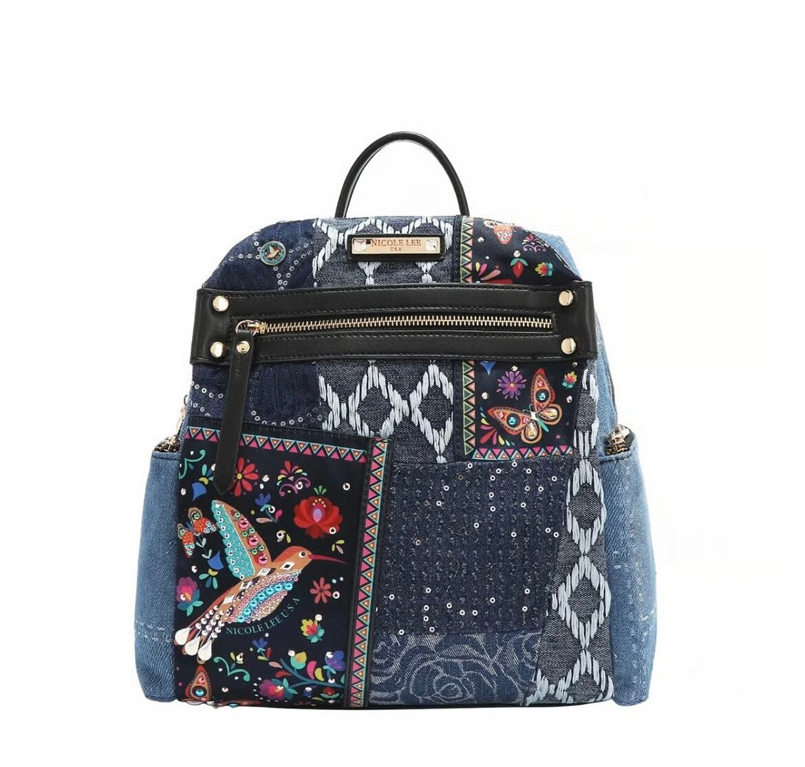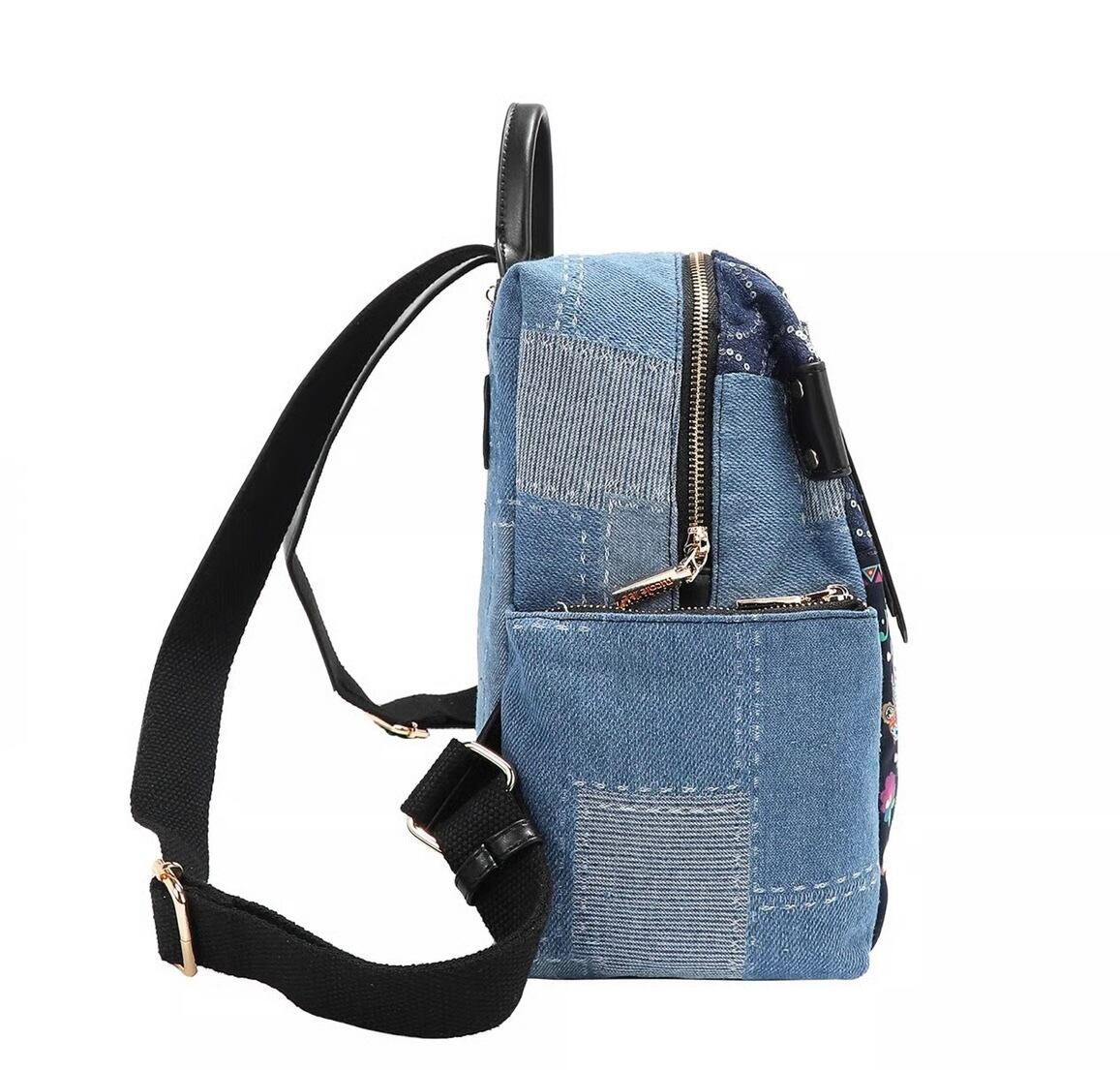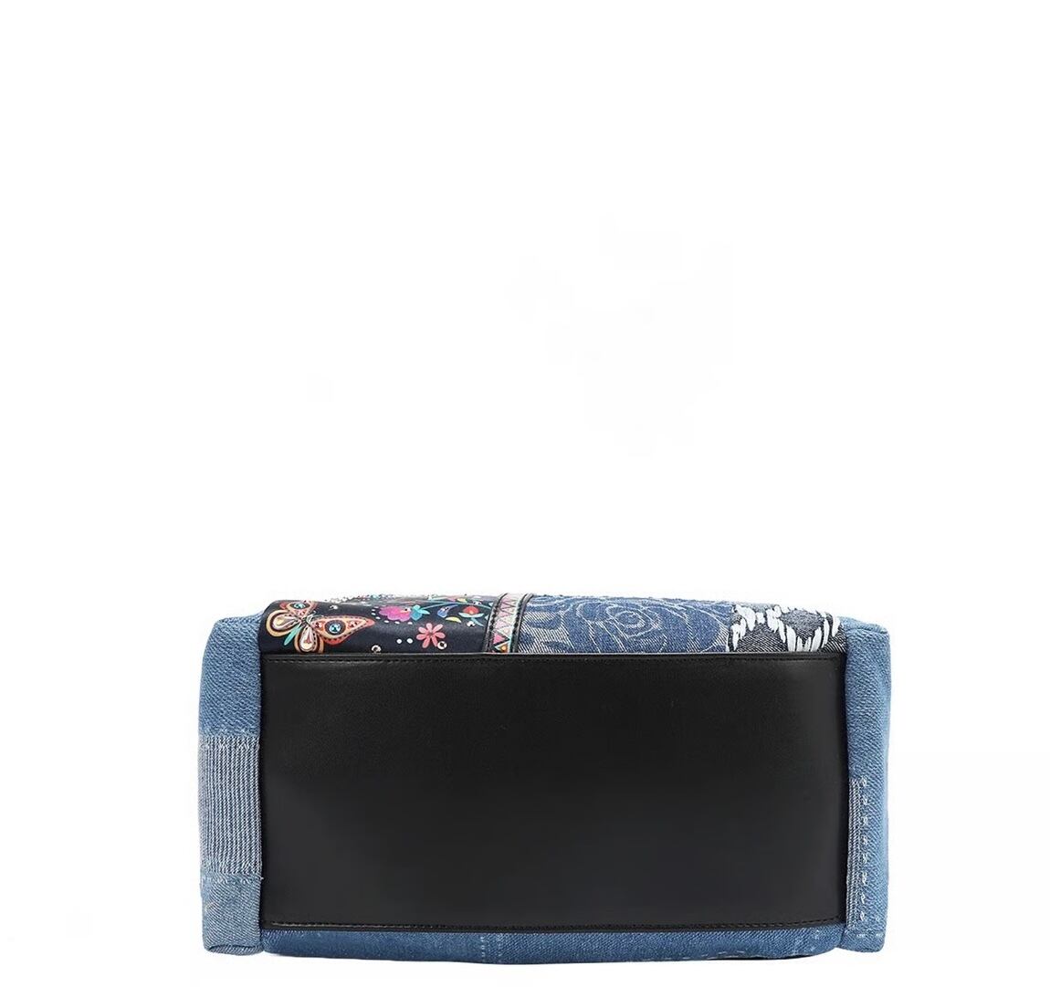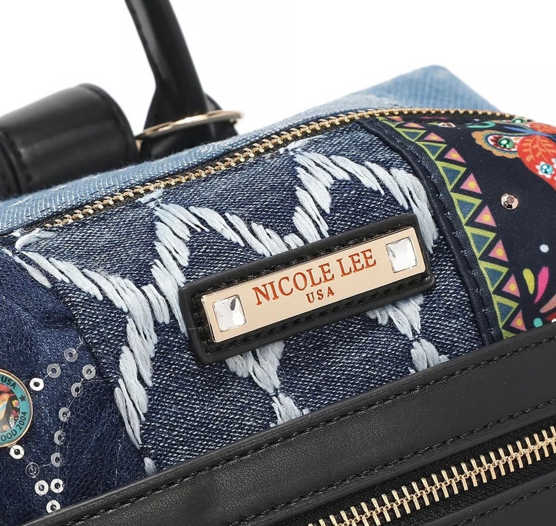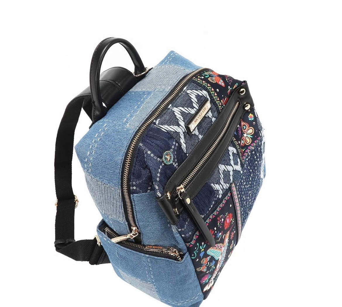 大胆でシックなボヘミアン調のデザインが施された「Bosque de Amor」デニムバックパック。遊び心溢れるデザインがコーディネートを引き立てます。