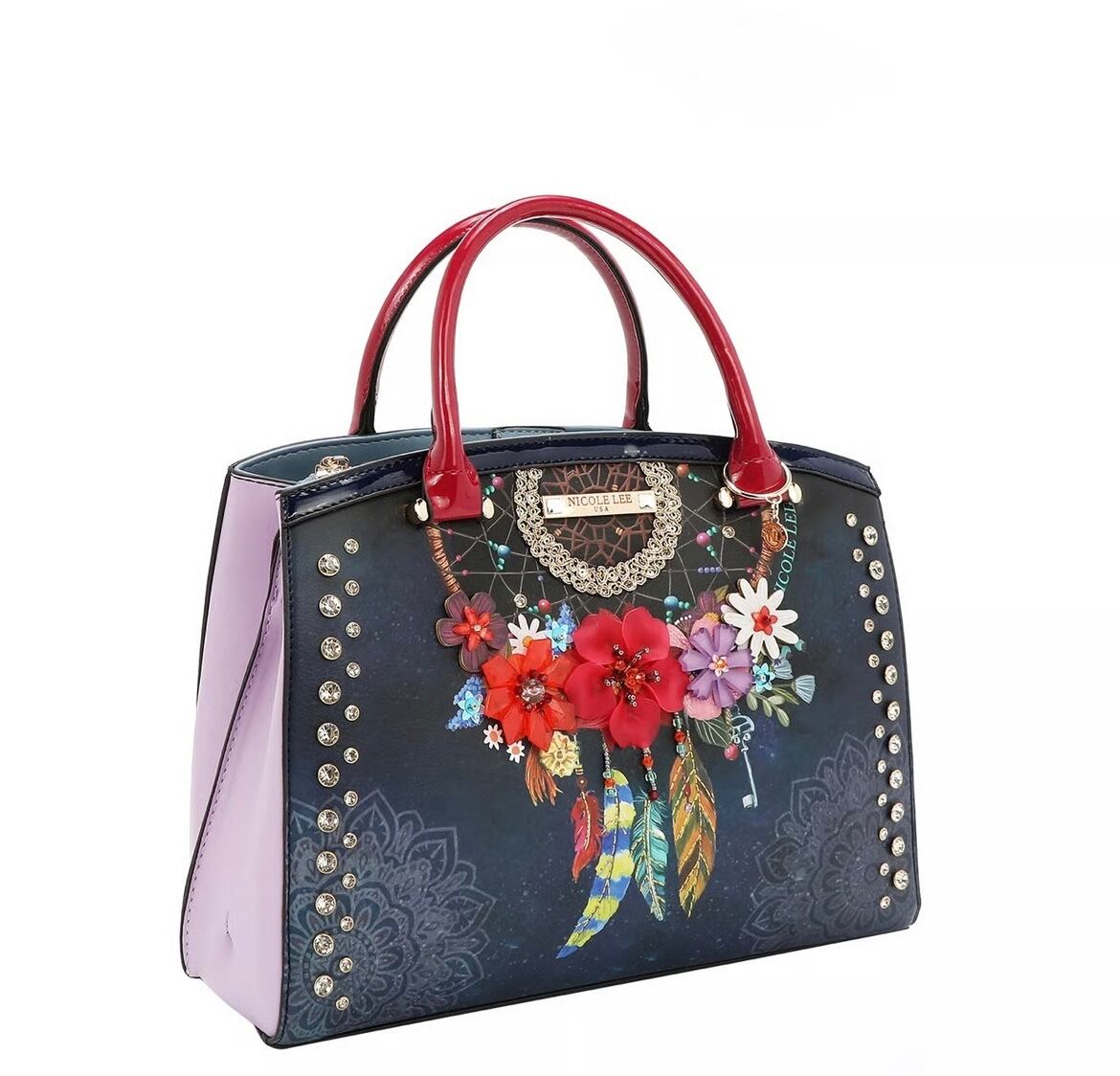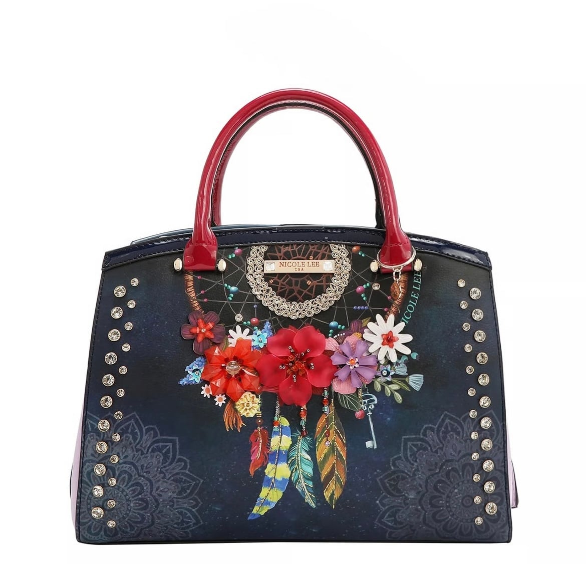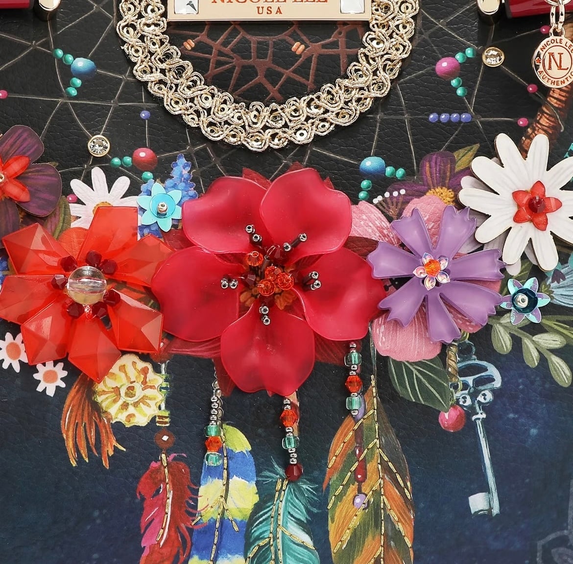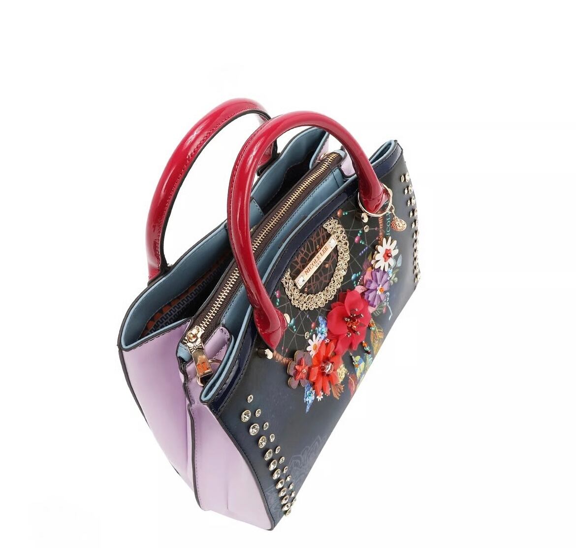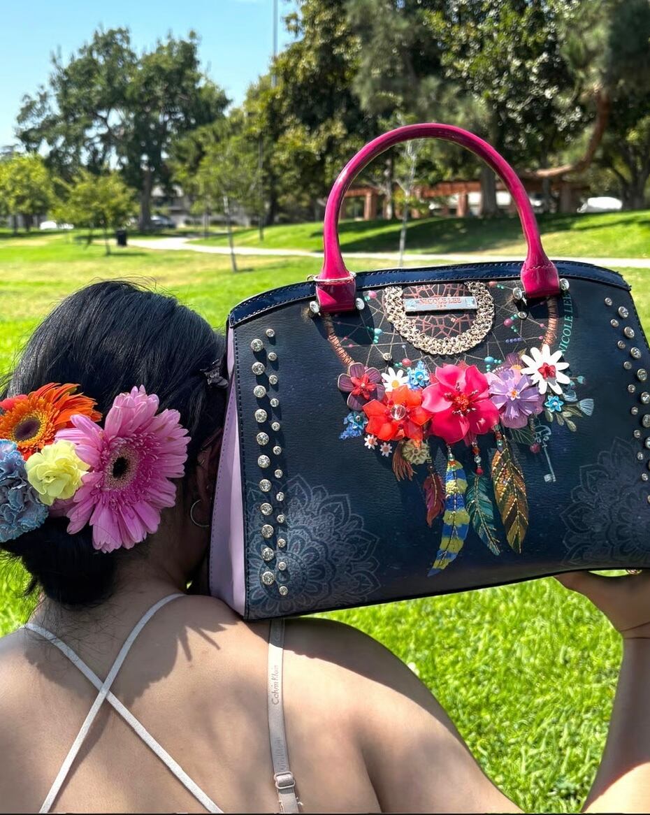 『美しさ』 『自由』 『勇気』 が表現されたこのサッチェルバッグは、高級感を感じさせるゴールドチェーンやビーズ、花の装飾が目を引く人気シリーズです。
