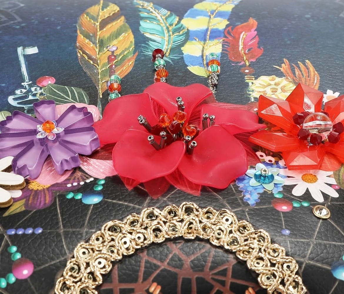 前面には花やスパンコール、ビーズといった装飾が施され、華やかさを演出しています。