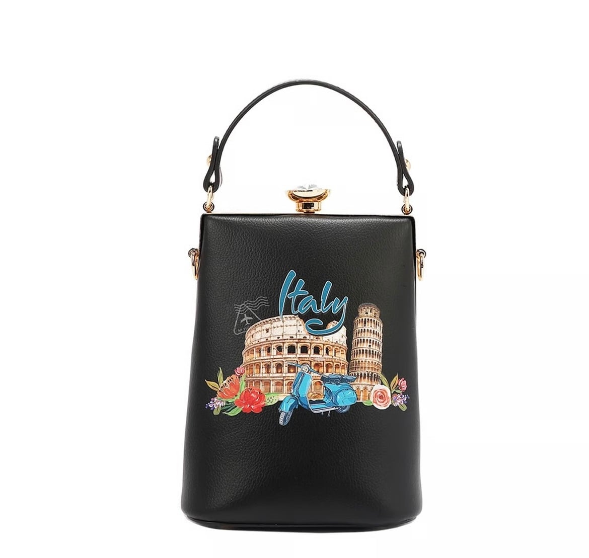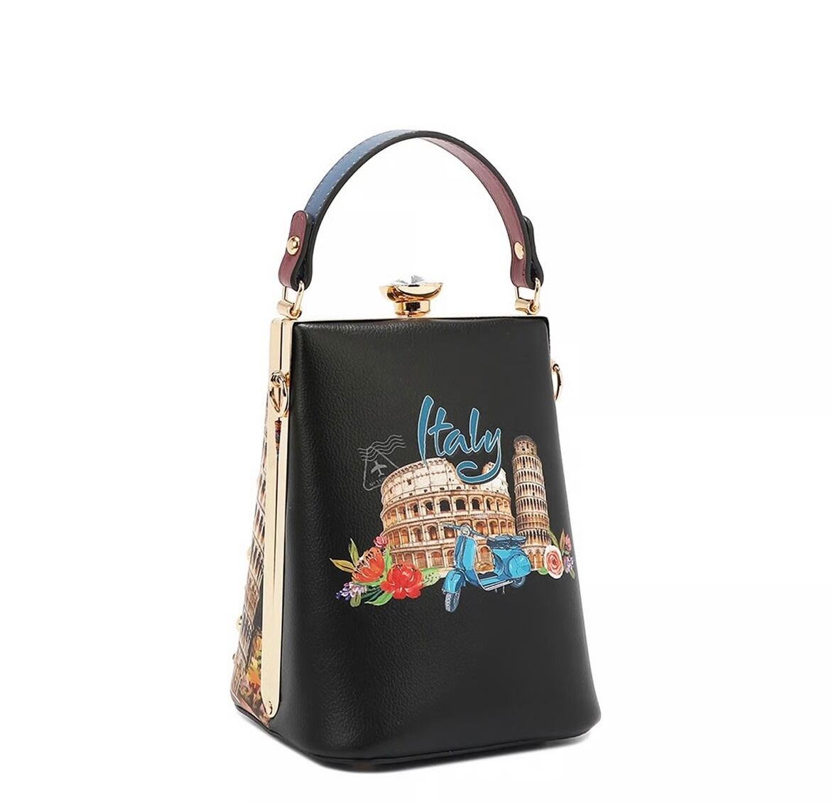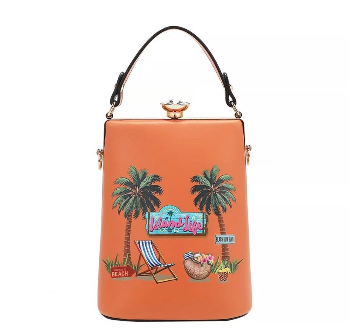 ダイヤモンド ストーンの留め具が特徴的な持ち手の付いたクラッチ ハンドバッグ。どんな服装にも印象的でエレガントな雰囲気を添えるようデザインされいます。